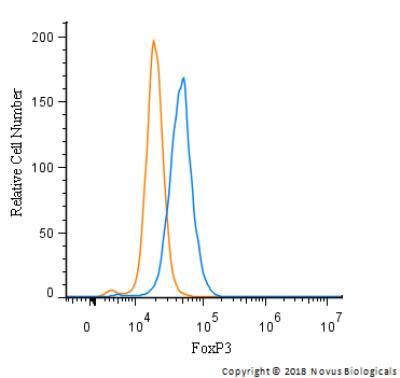 - Flow Cytometry: FoxP3 Antibody [NB100-39002] - An intracellular stain was performed on MCF7 cells with FoxP3 Antibody NB100-39002PE (blue) and a matched isotype control (orange). Cells were fixed with 4% PFA and then permeablized with 0.1% saponin. Cells were incubated in an antibody dilution of 5 ug/mL for 30 minutes at room temperature. Both antibodies were conjugated to Phycoerythrin.