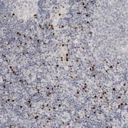 - Immunohistochemical staining of human tonsil shows strong nuclear positivity in a subset of lymphoid cells outside reaction centra.