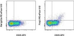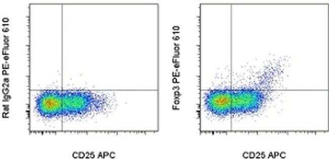 - Staining of normal human peripheral blood cells with Anti-Human CD25 APC (Product # 17-0257-42), followed by intracellular staining with Rat IgG2a K Isotype Control PE-eFluor® 610 (Product # 61-4321-82) (left) or Anti-Human Foxp3 PE-eFluor® 610 (right) using the Foxp3/Transcription Factor Staining Buffer Set (Product # 00-5523-00) and protocol. Cells in the lymphocyte gate were used for analysis.
