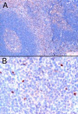 - STJ70110 (1µg/ml) staining of paraffin embedded Human Tonsil. Microwaved antigen retrieval with Tris/EDTA buffer pH9, HRP-staining. A) Nuclear staining of scattered cells in the interfollicular area. B) High magnification of positive cells. This data is from a previous batch, not on sale.