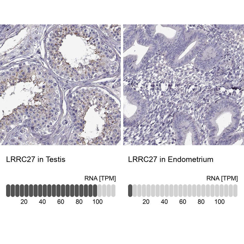- Immunohistochemistry analysis in human testis and endometrium tissues using Anti-LRRC27 antibody. Corresponding LRRC27 RNA-seq data are presented for the same tissues.