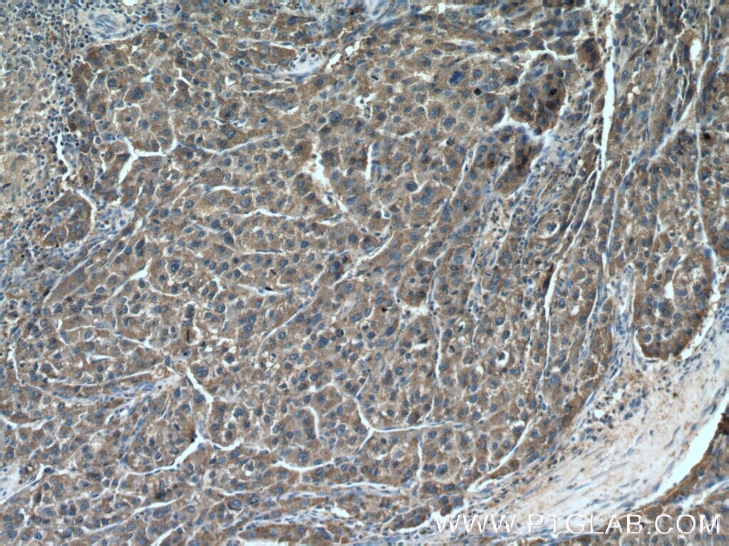 - Immunohistochemical analysis of paraffin-embedded human liver cancer tissue slide using (Product # 21870-1-AP) (DUS4L Antibody) at dilution of 1:200 (under 10x lens).