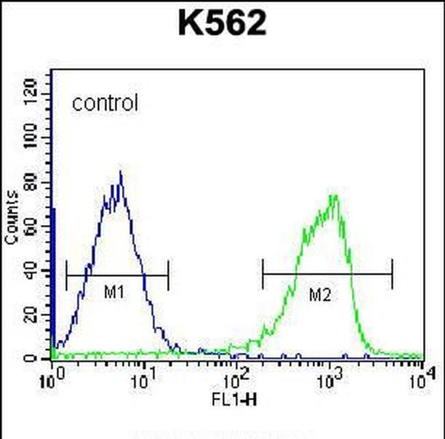 - Flow cytometric analysis of ZNF623 in K562 cells (right histogram) compared to a negative control cell (left histogram). Cells were probed with a ZNF623 Antibody (C-term) (Product # PA5-48434). Following incubation with the primary antibody, cells were incubated with FITC-conjugated goat-anti-rabbit secondary antibodies
