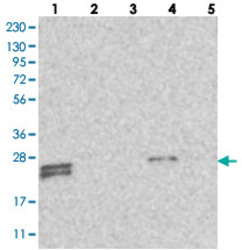 - Western blot analysis of Lane 1: RT-4, Lane 2: U-251 MG, Lane 3: Human Plasma, Lane 4: Liver, Lane 5: Tonsil with TMEM9B polyclonal antibody (Cat # PAB23164).