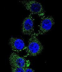 - Confocal immunofluorescent analysis of C4orf21 Antibody (N-term)(Cat#AP50626PU-N) with 293 cell followed by Alexa Fluor 488-conjugated goat anti-rabbit lgG (green). DAPI was used to stain the cell nuclear (blue).