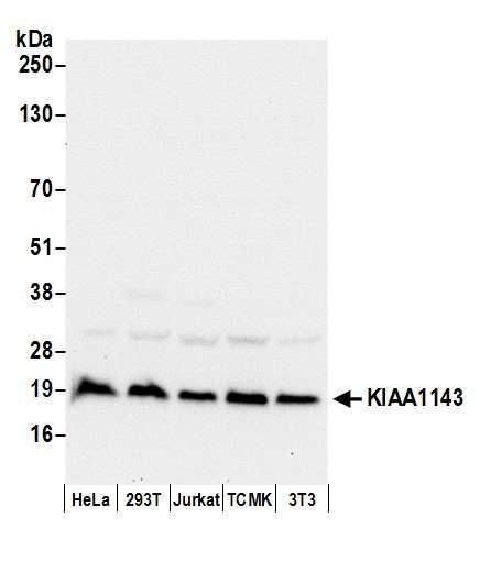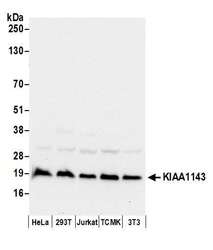 - Detection of human and mouse KIAA1143 by western blot. Samples: Whole cell lysate (50 µg) from HeLa, HEK293T, Jurkat, mouse TCMK-1, and mouse NIH 3T3 cells prepared using NETN lysis buffer. Antibodies: Affinity purified rabbit anti-KIAA1143 antibody used for WB at 0.04 µg/ml. Detection: Chemiluminescence with an exposure time of 10 seconds.