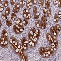 - Immunohistochemical staining of human duodenum with PRAP1 polyclonal antibody (Cat # PAB23334) shows strong cytoplasmic positivity in glandular cells at 1:200-1:500 dilution.