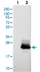 - Western blot analysis of Lane 1: Negative control (vector only transfected HEK293T lysate), Lane 2: Over-expression Lysate (Co-expressed with a C-terminal myc-DDK tag (~3.1 kDa) in mammalian HEK293T cells) with PRAP1 polyclonal antibody (Cat # PAB23334).