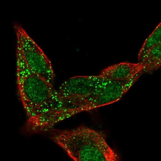 - Immunofluorescent staining of PRAP1 in human cell line Hep G2 using a PRAP1 Polyclonal Antibody (Product # PA5-58508) shows localization to nucleoplasm and vesicles.