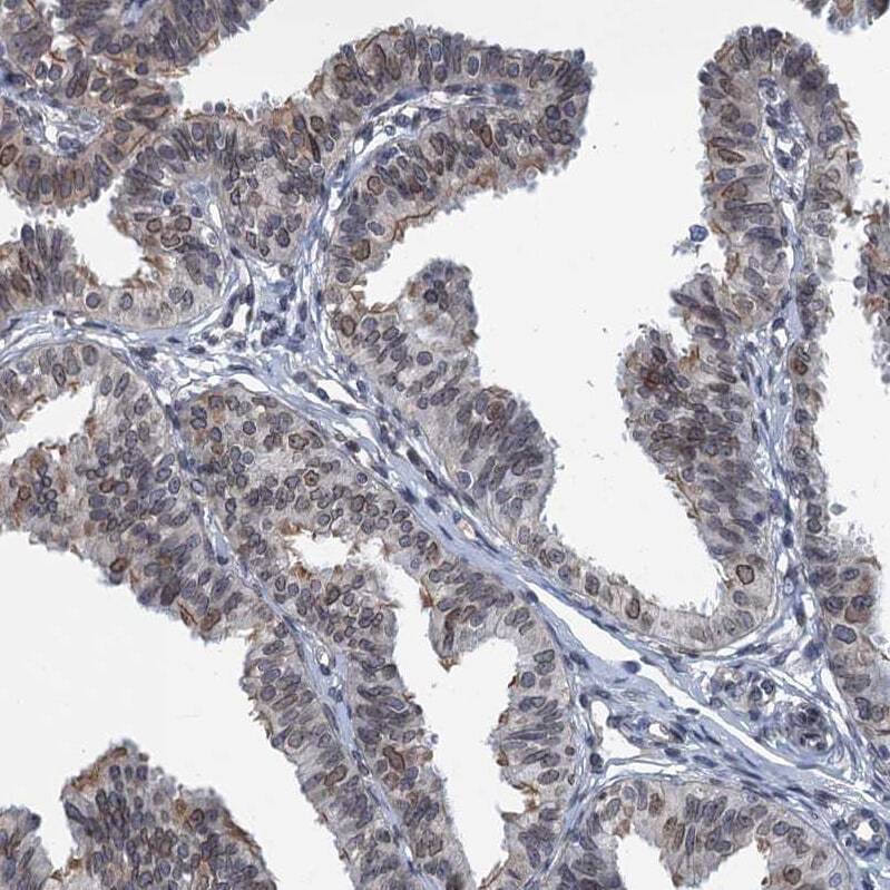 - Immunohistochemical analysis of CCDC34 in human fallopian tube using CCDC34 Polyclonal Antibody (Product # PA5-58016) shows moderate nuclear membrane positivity in glandular cells.