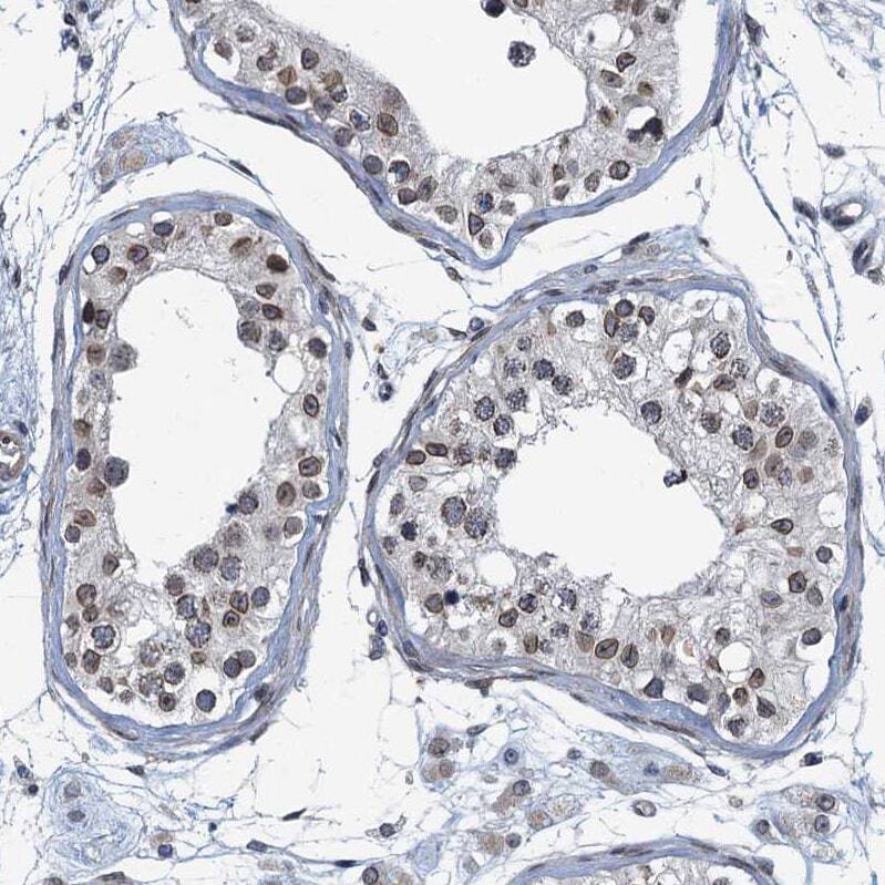 - Immunohistochemical analysis of CCDC34 in human testis using CCDC34 Polyclonal Antibody (Product # PA5-58016) shows moderate nuclear membrane positivity in cells in seminiferous ducts.