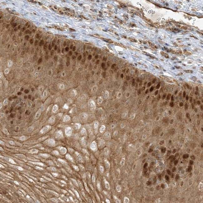 - Immunohistochemical analysis of NAF1 in human esophagus using NAF1 Polyclonal Antibody (Product # PA5-57582) shows strong nuclear and cytoplasmic positivity in squamous epithelial cells.