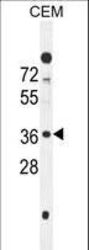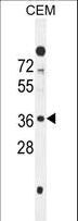 - C10orf78 Antibody western blot of CEM cell line lysates (35 ug/lane). The C10orf78 antibody detected the C10orf78 protein (arrow).