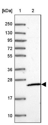 - Western Blot: MRPS26 Antibody [NBP1-92141] - Lane 1: Marker [kDa] 250, 130, 95, 72, 55, 36, 28, 17, 10. Lane 2: Human cell line RT-4