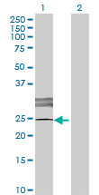 - Western Blot analysis of LOC619207 expression in transfected 293T cell line (H00619207-T01) by LOC619207 MaxPab polyclonal antibody.Lane 1: LOC619207 transfected lysate(25.52 KDa).Lane 2: Non-transfected lysate.