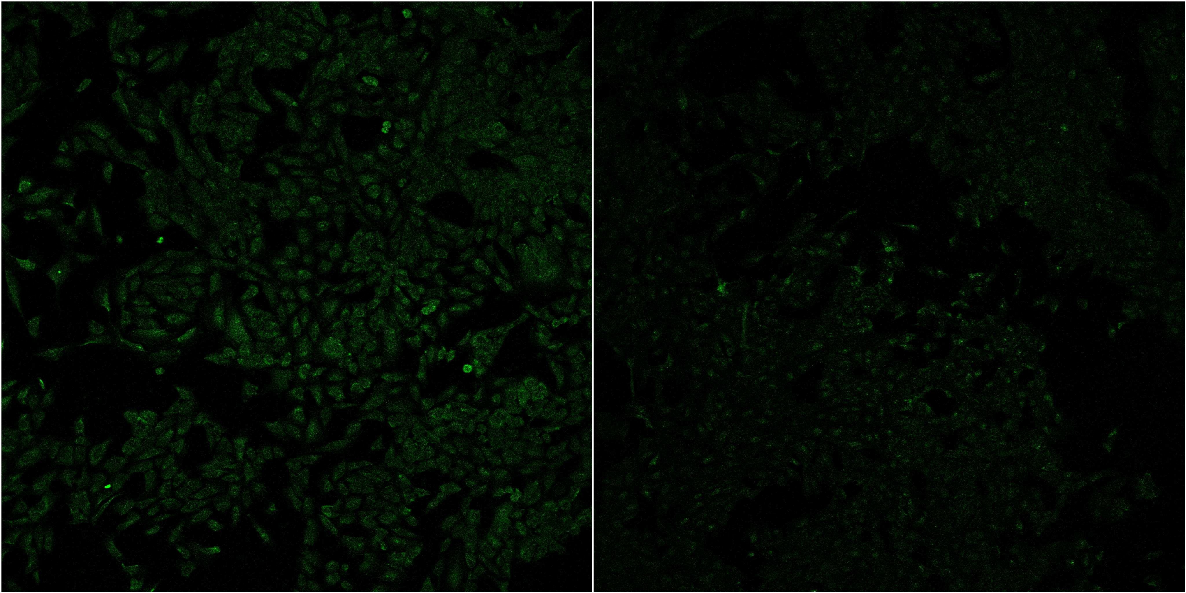 - Confocal images of immunofluorescently stained human U-2 OS cells.The protein SPATS2 is shown in green. The image to the left show cells transfected with control siRNA and the image to the right show cells where SPATS2 has been downregulated with specific siRNA.
