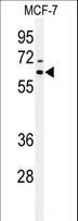 - Western blot of IRGQ Antibody in MCF-7 cell line lysates (35 ug/lane). IRGQ (arrow) was detected using the purified antibody.