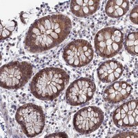 - Immunohistochemical staining of human colon with IRGQ polyclonal antibody (Cat # PAB24025) shows moderate cytoplasmic positivity in glandular cells at 1:200-1:500 dilution.