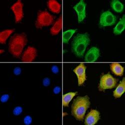 - Immunocytochemistry analysis of SEMA3C in HepG2 cells. The samples were fixed with PFA and permeabilized in 0.1% Triton X-100, then blocked in 10% serum for 45 minutes at 25°C. Samples were incubated with SEMA3C polyclonal antibody (Product # PA5-103168) and mouse anti-beta tubulin antibody for 1 hour at 37°C. An AlexaFluor594 conjugated goat anti-rabbit IgG (Red) and an AlexaFluor488 conjugated goat anti-mouse IgG (Green) were used as the secondary antibodies. The nuclear counter stain is DAPI (blue).