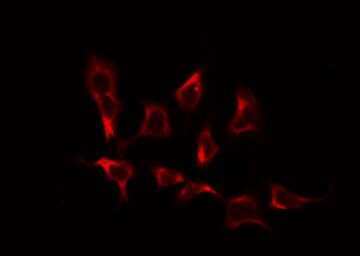 - Immunofluorescent analysis of BRP44L in COLO205 cells. Samples were fixed with paraformaldehyde, permeabilized with 0.1% Triton X-100, blocked with 10% serum (45 min at 25°C) incubated with BRP44L polyclonal antibody (Product # PA5-101468) using a dilution of 1:200 (1 hr, 37°C), and followed by goat anti-rabbit IgG Alexa Fluor 594 at a dilution of 1:600.