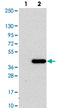 - Western blot analysis of Lane 1: Negative control (vector only transfected HEK293T lysate).Lane 2: Over-expression lysate (Co-expressed with a C-terminal myc-DDK tag (~3.1 kDa) in mammalian HEK293T cells with TEX26 polyclonal antibody (Cat # PAB23660).