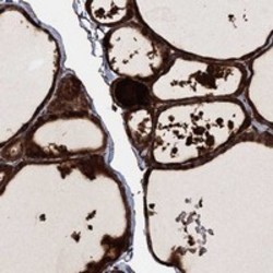 - Immunohistochemical staining of human thyroid gland with TEX26 polyclonal antibody (Cat # PAB23660) shows distinct cytoplasmic and extracellular positivity in glandular cells at 1:50-1:200 dilution.