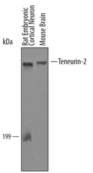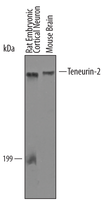 - Detection of Mouse and Rat Teneurin-2 by Western blot. Western blot shows lysates of mouse brain tissue and rat embryonic cortical neuron cells. PVDF Membrane was probed with 1 µg/mL of Human Teneurin-2 Antigen Affinity-purified Polyclonal Antibody (Catalog # AF4578) followed by HRP-conjugated Anti-Sheep IgG Secondary Antibody (Catalog # HAF016). A specific band was detected for Teneurin-2 at approximately 300 kDa (as indicated). This experiment was conducted under reducing conditions and using Immunoblot Buffer Group 8.