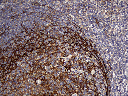 - Immunohistochemical staining of paraffin-embedded Human lymphoma tissue using anti-FAM151B mouse monoclonal antibody.(Heat-induced epitope retrieval by 1mM EDTA in 10mM Tris buffer (pH8.5) at 120°C for 3 min, TA811466)(1:500)
