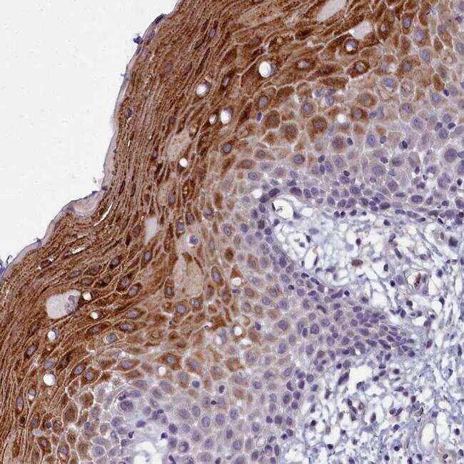 - Immunohistochemical analysis of DEFB108B in human oral mucosa using DEFB108B Polyclonal Antibody (Product # PA5-60037) shows strong cytoplasmic positivity in superficial squamous epithelial cells.