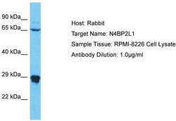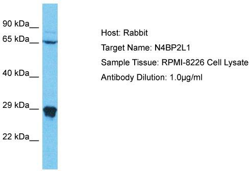 - Host: Rabbit; Target Name: N4BP2L1; Sample Tissue: RPMI-8226 Whole Cell lysates; Antibody Dilution: 1.0 ug/mlN4BP2L1 is strongly supported by BioGPS gene expression data to be expressed in RPMI-8226