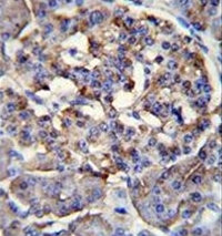- Immunohistochemistry analysis in formalin fixed and paraffin embedded human pancreas tissue reacted with LRRC68 Antibody (N-term) ?, which was?followed peroxidase conjugated to the secondary antibody followed by DAB staining.