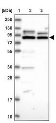 - Western Blot: LRRC68 Antibody [NBP1-90889] - Lane 1: Marker [kDa] 250, 130, 95, 72, 55, 36, 28, 17, 10Lane 2: Human cell line RT-4Lane 3: Human cell line U-251MG sp