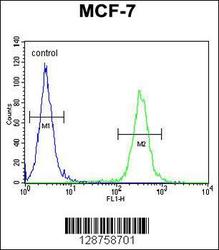 - NKPD1 Antibody (C-term) (Cat. #AP10916b) flow cytometric analysis of MCF-7 cells (right histogram) compared to a negative control cell (left histogram).FITC-conjugated goat-anti-rabbit secondary antibodies were used for the analysis.