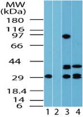 - Western blot of FUZ in human lung lysate in the 1) absence and 2) presence of immunizing peptide, 3) mouse lung and 4) rat lung using FUZ / FY Antibody at 2.0 ug/ml, 2.0 ug/ml and 6.0 ug/ml respectively.