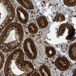 - Immunohistochemical staining of human stomach shows strong cytoplasmic positivity in glandular cells.