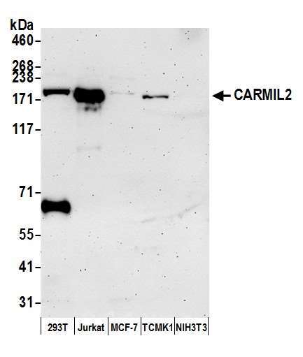 - Detection of human and mouse CARMIL2 by western blot. Samples: Whole cell lysate (50 µg) from HEK293T, Jurkat, MCF-7, mouse TCMK-1, and mouse NIH 3T3 cells prepared using NETN lysis buffer. Antibody: Affinity purified rabbit anti-CARMIL2 antibody used for WB at 1:1000. Detection: Chemiluminescence with an exposure time of 3 minutes.