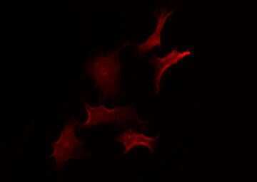 - Immunofluorescent analysis of ZDHHC20 in HeLa cells. Samples were fixed with paraformaldehyde, permeabilized with 0.1% Triton X-100, blocked with 10% serum (45 min at 25°C) incubated with ZDHHC20 polyclonal antibody (Product # PA5-101778) using a dilution of 1:200 (1 hr, 37°C), and followed by goat anti-rabbit IgG Alexa Fluor 594 at a dilution of 1:600.