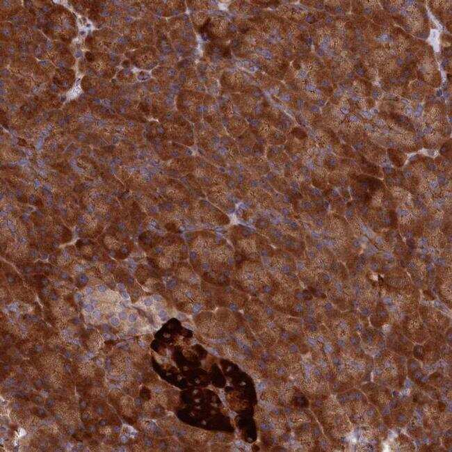 - Immunohistochemical analysis of DDX60L in human pancreas using DDX60L Polyclonal Antibody (Product # PA5-60278) shows strong cytoplasmic positivity in exocrine glandular cells.