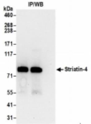 - Immunoprecipitation: STRN4 Antibody [NBP2-36537] - Samples: Whole cell lysate (0.5 or 1.0 mg per IP reaction; 20% of IP loaded) from 293T cells prepared using NETN lysis buffer. For blotting immunoprecipitated Striatin-4, A304-573A was used at 0.4 ug/ml. Detection: Chemiluminescence with an exposure time of 30 seconds.