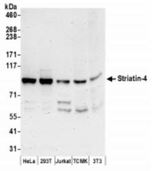 - Western Blot: STRN4 Antibody [NBP2-36537] - Samples: Whole cell lysate (50 ug) from HeLa, 293T, Jurkat, mouse TCMK-1, and mouse NIH3T3 cells prepared using NETN lysis buffer. Antibodies: Affinity purified rabbit anti-Striatin-4 antibody used for WB at 0.1 ug/ml. Detection: Chemiluminescence with an exposure time of 3 minutes.
