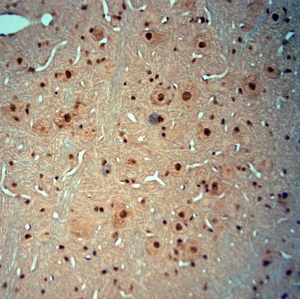 - IHC-P on paraffin sections of rat spinal cord.The animal was perfused using Autoperfuser at a pressure of 130 mmHg with 300 ml 4% FA before being processed for paraffin embedding. HIER: Tris-EDTA, pH 9 for 20 min using Thermo PT Module.Blocking: 0.2% LFDM in TBST filtered thru 0.2 um. Detection was done using Novolink HRP polymer from Leica following manufacturer's instructions; DAB chromogen. Primary antibody dilution 1: 1000, incubated 30 min at RT using Autostainer. Sections were counterstained with Harris Hematoxylin.Small neurons are stained and also some nuclear staining is observed.