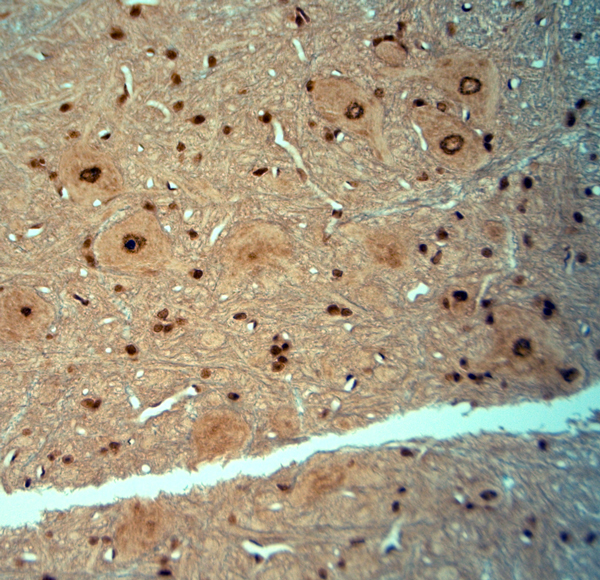 - IHC-P on paraffin sections of mouse spinal cord.The animal was perfused using Autoperfuser at a pressure of 130 mmHg with 300 ml 4% FA before being processed for paraffin embedding. HIER: Tris-EDTA, pH 9 for 20 min using Thermo PT Module.Blocking: 0.2% LFDM in TBST filtered thru 0.2 um. Detection was done using Novolink HRP polymer from Leica following manufacturer's instructions; DAB chromogen. Primary antibody dilution 1: 1000, incubated 30 min at RT using Autostainer. Sections were counterstained with Harris Hematoxylin.Small neurons are stained and also some nuclear staining is observed.