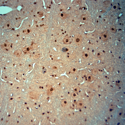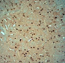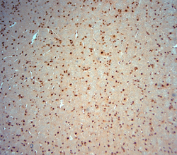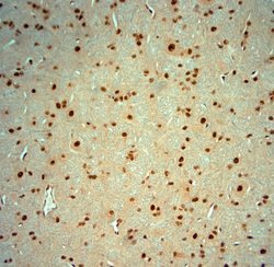 - IHC-P on paraffin sections of rat brain.The animal was perfused using Autoperfuser at a pressure of 130 mmHg with 300 ml 4% FA before being processed for paraffin embedding. HIER: Tris-EDTA, pH 9 for 20 min using Thermo PT Module.Blocking: 0.2% LFDM in TBST filtered thru 0.2 um. Detection was done using Novolink HRP polymer from Leica following manufacturer's instructions; DAB chromogen. Primary antibody dilution 1: 1000, incubated 30 min at RT using Autostainer. Sections were counterstained with Harris Hematoxylin.Small neurons are stained and also some nuclear staining is observed.