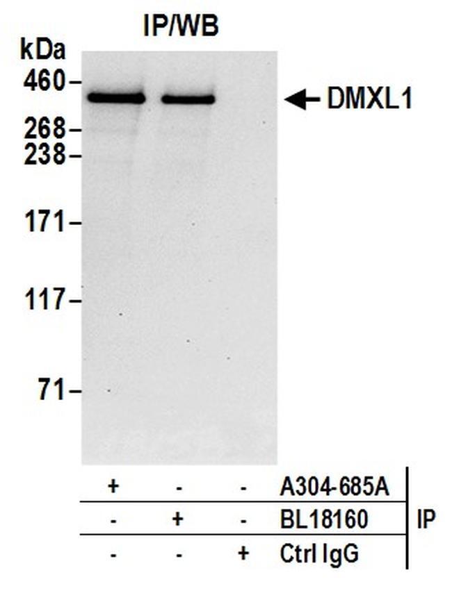 - Detection of human DMXL1 by western blot of immunoprecipitates. Samples: Whole cell lysate (0.5 or 1.0 mg per IP reaction; 20% of IP loaded) from 293T cells prepared using NETN lysis buffer. Antibodies: Affinity purified rabbit anti-DMXL1 antibody A304-685A (lot A304-685A-1) used for IP at 6 µg per reaction. DMXL1 was also immunoprecipitated by rabbit anti-DMXL1 antibody BL18160. For blotting immunoprecipitated DMXL1, A304-685A was used at 1 µg/ml. Detection: Chemiluminescence with an exposure time of 30 seconds.