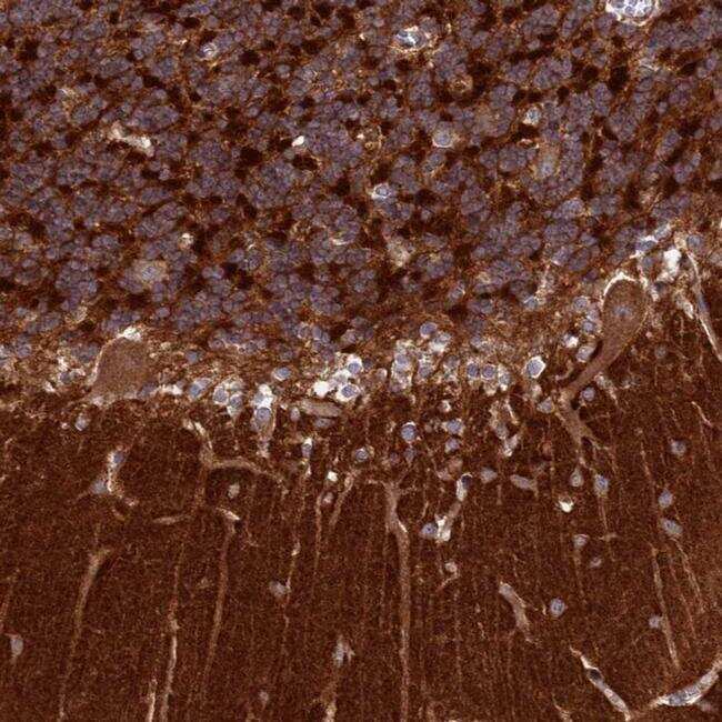 - Immunohistochemical staining of IGLON5 in human cerebellum tissue shows strong positivity. Samples were probed using an IGLON5 Polyclonal Antibody (Product # PA5-59812).