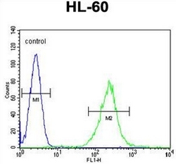 - Flow cytometric analysis of HL-60 cells using ECAT1 Antibody (N-term) ??(right histogram) compared to a negative control cell (left histogram). FITC-conjugated goat-anti-rabbit secondary antibodies were used for the analysis.