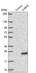 - Western blot analysis in control (vector only transfected HEK293T lysate) and CABP5 over-expression lysate (Co-expressed with a C-terminal myc-DDK tag (~3.1 kDa) in mammalian HEK293T cells, LY412686).