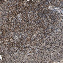 - Immunohistochemical staining of human tonsil shows moderate cytoplasmic and nuclear positivity in lymphoid cells outside reaction centra.