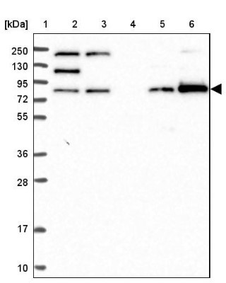 - Western Blot: ANKRD13A Antibody [NBP2-38505] - Lane 1: Marker [kDa] 250, 130, 95, 72, 55, 36, 28, 17, 10. Lane 2: Human cell line RT-4. Lane 3: Human cell line U-251MG. Lane 4: Human Plasma. Lane 5: Human liver tissue. Lane 6: Human tonsil tissue