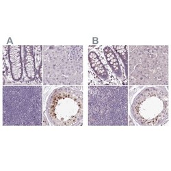 - Immunohistochemistry-Paraffin: C1orf56 Antibody [NBP2-32683] - Staining of human colon, liver, lymph node and testis using Anti-C1orf56 antibody NBP2-32683 (A) shows similar protein distribution across tissues to independent antibody NBP1-82174 (B).